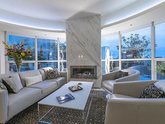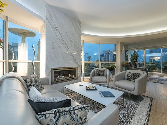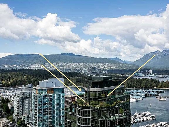 Watch the sunrise and sunset from this breathtaking 180 degree view Penthouse. This stunning air conditioned property delivers exquisite sophistication throughout every inch of its spacious 1,598 square feet. This exclusive 1.5 level home offers 2 bedrooms, Den, 2 bathrooms. Bathrooms have the Nu Heat underfloor Heating System for added comfort. A gourmet kitchen, floor to ceiling windows, private East/West walk out terraces! The kitchen features a large island, top of the line stainless steel appliances, Double Dishwasher and quartz countertops. Sonos Sound System throughout PH3 offers spectacular outdoor entertaining space with over 1,700 sf of fully landscaped patios all with fabulous views. Stanley Park, community centre, seawall, shops, restaurants are steps away. An oasis in the sky!
