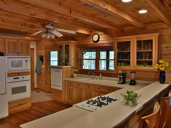 Private 3BR / 2B 2350sf custom built log home surrounded by hardwood forest on 4.7 ac. Superb craftsmanship is obvious here with natural wood throughout - exposed beams; vaulted ceilings; yellow pine floors; beautiful hickory cabinetry in kitchen; maple cabinetry in baths. Relax on the wide, full-length, covered front porch before coming through the oak and leaded glass door. Just past the coat closet is the living area with bay window and dining area. Split floor plan with large (11x23) master BR, 8x8 walk-in closet, master bath with dual vanity and matching cabinet. Centrally located laundry room with utility sink. Open kitchen with corian counters, double sink, raised dishwasher!, and gas stove top. Pantry adjoining kitchen has cabinets, bookshelves, settee, and counter top which could be used as off-kitchen office. Kitchen overlooks family room with beautiful brick fireplace and entertainment wall. French doors lead to covered back porch with facilities for hot tub and BBQ grill. Remaining bedrooms (11x12 and 11x14) are separated by the 2nd bath. Front bedroom is also setup to function as an office with built-in bookshelves and 4-drawer file cabinet. Home has ¾ basement (1372sf storage + 468sf 2-car garage) under air (but not included in 2350sf figure). Basement has 9’ ceiling and is also plumbed for 3rd bath. Permanently installed 1100lb gun safe conveys and it is a (gloss black and chrome) beauty. Professional grade shelving along both long walls included. Detached, freestanding steel shop (30 x 40 x 16) has water, 220 electric, industrial lighting, ventilation, and skylights. Shop is completely insulated, has one personnel door and one vehicle door (14x14) large enough to accommodate RV. There is an RV hookup on outside of shop plus a separate carport large enough to accommodate your RV. Extremely well built storage shed (10x16) is handy and secure. Small back yard is fenced (chain link) for pets. 1000 gal propane tank (conveys, not rented) provides fuel for furnace, water heater, clothes dryer, stove top, fire place, and quick-connect on back deck for BBQ grill. Water heater utilizes a circulation pump for instant hot water throughout the house. Air conditioning is provided by 5-ton refrigeration unit, air pump for heat, gas furnace (new in 2018) for heat when outside air drops below 45 degrees. Supplemental heat with air-tight wood stove in basement. Gas fireplace in family room provides push button ambiance. Includes all appliances, furnishings, entertainment package, gun safe, hot tub. Seller has all maintenance and repair records and will also convey original blueprints for home and shop. Buyer to assume closing costs.