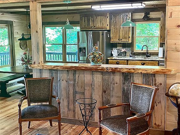 TURN KEY - CALL 813-679-3370 for an appointment. Major renovation to a classic Appalachian style cabin nestled on a ridge-line in the popular Aska Adventure area of Blue Ridge, GA. This 3 bed/3.5 bath home has amazing mountain views combined with the sound of the Toccoa River rapids to create the perfect mountain experience. A generous party porch overlooks beautiful close and long range Mountain View’s that are ever changing. Spacious vaulted great room on the main w/ private master suite. Sep powder rm and laundry also on main. New rustic modern custom kitchen w/ stainless steel appliances and granite countertops. On the main floor, the massive stack stone fireplace has gas logs. Downstairs there are two master suites. One has a private entrance to the parking area. In the sitting area there’s a freestanding gas fireplace, and one of the master suites has a beautiful stone fireplace piped for gas. Also, on the lower level there’s a pool table, and a smart TV, a and large deck. A wooden deck walkway with handrails lead out to the parking area. Enjoy fly fishing, rafting, canoeing, tubing, hiking, mountain biking and all the fun Blue Ridge, GA has to offer! This home has never been rented, however it would command handsome rates per night or week.. New metal roof installed 6/2021. Located approximately 10-15 minutes to grocery stores and downtown Blue Ridge, where there are unique shops, dining, wine, sweets, clothing, antiques, and art shops. Art and craft shows, festivals, pumpkin patches, apple picking, and water falls. Blue Ridge and the Aska Adventure Area offer fun for the entire family. No need for a 4X4, River Bend Lane is paved with hard packed sections. Peace and tranquillity await you here. Pre qualified buyers only. Call for a tour. 813-679-3370