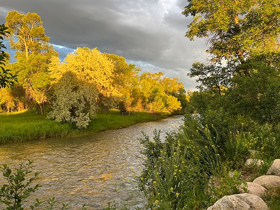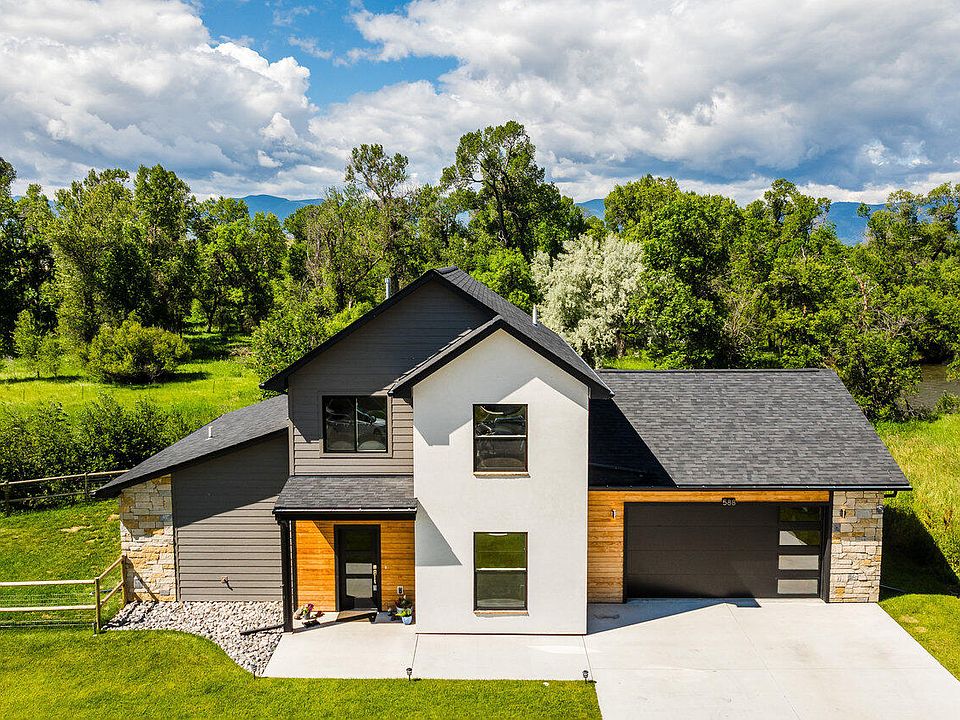 RIVER LIVING!! This modern luxury home on a 1/3 acre river lot is a private oasis. Enjoy morning coffee on the back patio or unwind by the fire pit with views of the river and Big Horn Mountains. This custom-designed home features two master suites, including a main floor suite with coffee bar and private entrance, also ideal for Airbnb lock-off rental. The stylish kitchen includes a spacious island and pantry, and the open-concept layout makes entertaining easy. Conveniences include a laundry/mudroom off the kitchen, 2nd-floor laundry hookups, and an oversized garage with a floor drain. The 2nd-floor master suite offers a luxurious en-suite bathroom and walk-in closet. The exterior combines teak shiplap, EIFS (stucco), and stone for a modern, inviting look! Lawn is paritally fenced.