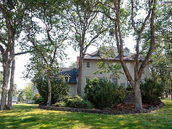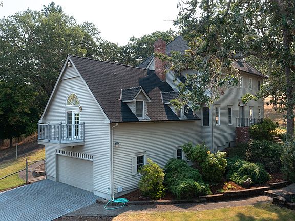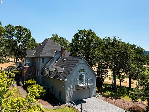 Built to the highest standards, with style to stand the test of time, this remarkable estate is what dreams are made of. The Georgian style home features elegant formal living spaces with judges paneling, fireplaces and stained glass windows to be offset by the warm embrace of the more casual great room with yet another fireplace, exposed brick and access to the covered patio. The kitchen is designed for multiple chefs to comfortably work with two cooking stations, two sinks, three convection ovens and center island. The walk-in panty is stunning with pine paneling and an abundance of storage. There is a large primary suite on the main level with walk-in closet, balcony and vaulted ceiling. Upstairs there is an additional en-suite with walk-in closet and bathroom featuring whirlpool tub and oversized shower. Two additional guest rooms with guest bath upstairs provides you with plenty of space. There is a large barn at the top of the hill, accessed via the paved driveway, with two stalls and room for more. The barn does have a second level for storage and equipment room with concrete floors. Next to the chicken coop, and yes that's a turret on the chicken coop, is a 5 stall machine shed. In the lower pastures is a scenic pond and covered hay storage. Whether you are looking for a stunning home, property for animals, privacy or breathtaking views this estate provides it all. Located only a few minutes from Roseburg with incredible views of Dixonville.
