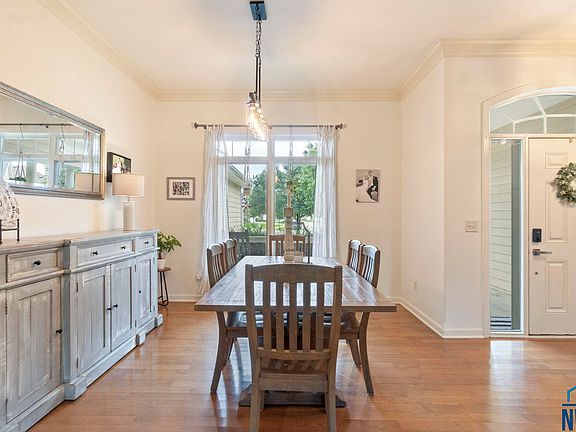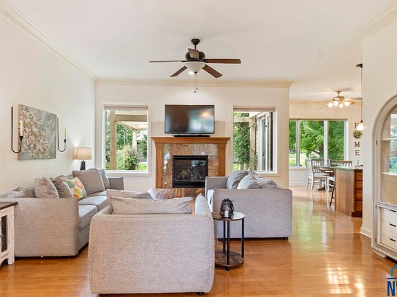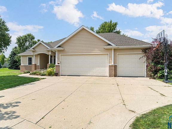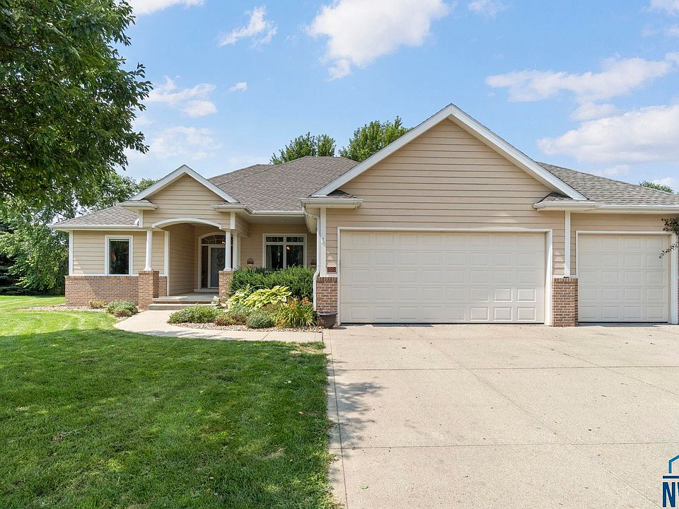 Welcome to this beautiful ranch-style home, built in 2008 by Wegher Construction and located at the end of a quiet cul-de-sac in the highly desirable Dakota Dunes community. Offering over 3,000 square feet of finished living space, this 5-bedroom, 3-bathroom home combines high-quality construction with thoughtful design and everyday comfort. The main floor features an open layout with 10-foot ceilings, hardwood floors, and large windows that fill the space with natural light. The spacious living room includes a gas fireplace and flows seamlessly into the dining and kitchen areas. The kitchen is well-appointed with granite countertops, a large island, hickory cabinets, a tile backsplash, and a walk-in pantry. Just off the kitchen, the main-floor laundry room offers added convenience with a utility sink and a fold-down ironing board. The primary suite serves as a private retreat, complete with a jetted whirlpool tub, double vanity, walk-in closet, and a separate water closet. Two additional bedrooms and a full bath are also located on the main level. Downstairs, the finished lower level features newer carpet, two large bedrooms with double closets, a 3/4 bathroom, and a generous living area with built in cabinets and counter space that is perfect for movie nights or entertaining guests. An oversized three-car garage provides ample storage and parking space. This home is ideally situated at the end of a cul-de-sac, offering privacy and a quiet setting. This is a rare opportunity to own a well-built, move-in ready home in one of Dakota Dunes' highly sought after areas!