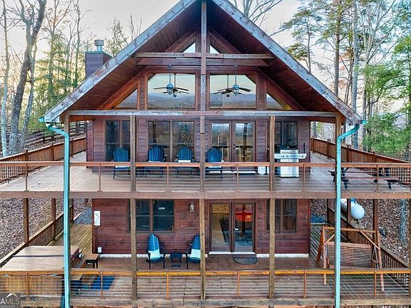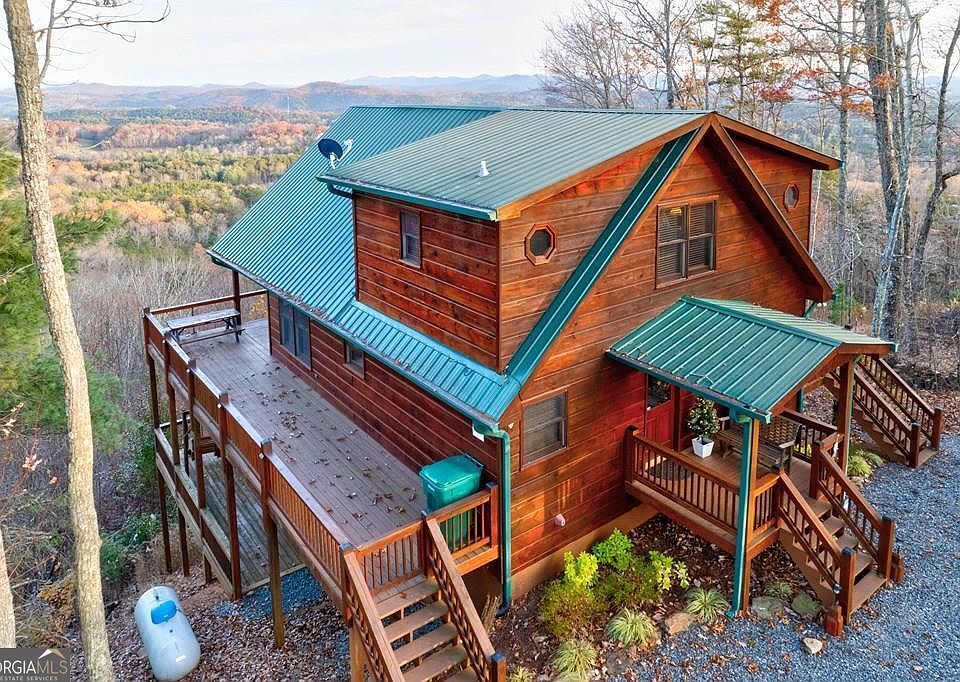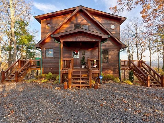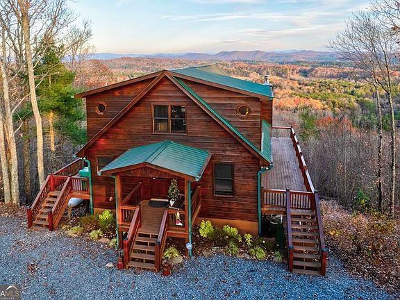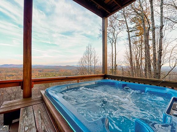 This is a must see turn key property! Brasstown Bald can be seen on a clear day. Phenomenal long range mountain views. As a short term rental, there is a great rental history and is beautifully maintained. The home boasts multiple outdoor spaces including two covered porches, or a patio with a hot tub to watch the sunrise to a firepit to watch the sunset. There are 3 bedrooms, 3 bathrooms, great room (on the main), and bonus room for entertaining in the basement. The stainless steel appliances, warm wood interior and 2 stone fireplaces make this house a home. Most of the furniture and pool table is included on a separate bill of sale.