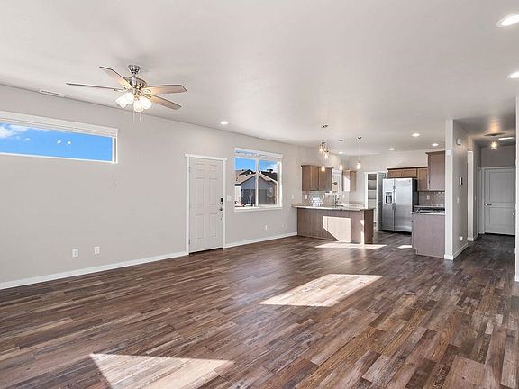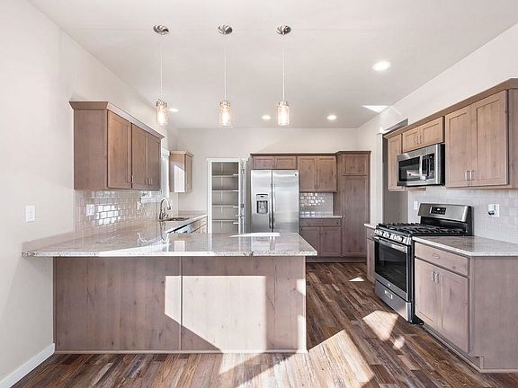 This beautiful home is perfectly situated on a corner lot up on a hill and is sure to impress! Side loading garage with wood accents above makes for great curb appeal. The dream kitchen features Knotty Alder Pecan stained cabinets, granite countertops, exquisite mocha colored backsplash, GE appliance package, gas range with broiler, and 6 x5 pantry. The open concept living/dining with ample natural light make the home appear bigger than it is. The primary bedroom/bath has a walk-in closet, his and hers sinks, beautiful tiled shower, barn door, and a privacy stall. The 2 additional bedroom closets have built in shelving as well as extra shelving in the hall closet. The large laundry room has a utility sink and an LG washer/dryer set that are included. This is a true lock and leave, HOA includes landscaping, yard maintenance, irrigation pump and system maintenance and snow removal. Enjoy your evening beverages from your back covered porch while you enjoy the views of the Mesa. Call today to make this your dream home.