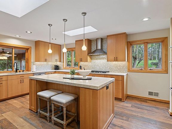 Discover timeless sophistication in this mid-century modern gem, gracefully situated on one of the largest lots in Shorewood’s coveted Boulder Bridge neighborhood. Designed with an open-concept layout and effortless flow, this 4-bedroom, 5-bath residence offers the perfect balance of form and function for entertaining and everyday living. The kitchen features stainless steel appliances, a large quartz island, and a cozy built-in booth for casual dining, complemented by a formal dining room ideal for gatherings. Multiple living areas—both formal and informal—are anchored by three beautiful fireplaces, while a spacious mudroom, main level laundry, and charming three-season porch add comfort and versatility to daily life. The main-floor primary suite provides a private retreat, with three additional bedrooms on the lower level offering generous accommodations for family or guests. Outside, enjoy sunset views from the hardwood porch and maintenance-free deck with a cozy outdoor fireplace, a sprawling flat backyard perfect for games or a future pool, and additional wooded acreage with endless possibilities. Step directly onto the neighborhood’s scenic 3-mile walking trail from your own backyard. Residents enjoy deeded dock access on Lake Minnetonka, along with community amenities including tennis courts, a park, and a storage barn. A three-car garage completes this exceptional home—a rare blend of mid-century design, natural beauty, and Lake Minnetonka lifestyle.