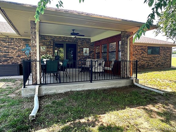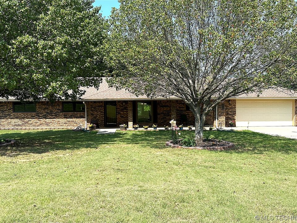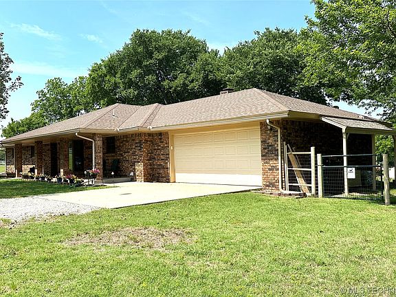Relish the gracefulness of this lovely ranch house sitting on 3+ acres (MOL) of green landscape and mature trees. You'll feel at home as soon as you step into the warm welcome of this spacious living room with a wood burning fireplace as the centerpiece for family gatherings or relaxation. The rooms are suffused with an abundance of natural lighting shining through new exceptional Anderson double pane windows. The neutral color palette presents a blank slate for your own interior design. The kitchen is a concoction of granite counter space and all major appliances that stay with the home including the washer and dryer. The master bedroom is a roomy launch pad for the day. In addition to the convenience of the private bathroom (walk-in shower), you will find ample closet space for your wardrobe. The other two bedrooms are ready for your personal touches. Exterior includes an inviting patio and breezy front and back porches. Your outdoor furniture transforms the patio into an open-air lounge, an ideal foundation for socializing, but also simply a great spot to relax and enjoy the impressive views of the nearby trees and green landscape. Property includes a storm cellar to help keep you safe from mother nature if you need it. To the north of the home there is a 12x16 shed you can use for storage and a 19x30 barn. Just a short commute to Winstar Casino and Lake Murray, be sure to plan some quality time with friends and family. This captivating abode is a notable opportunity in a desirable area so get your competitive offer in early.