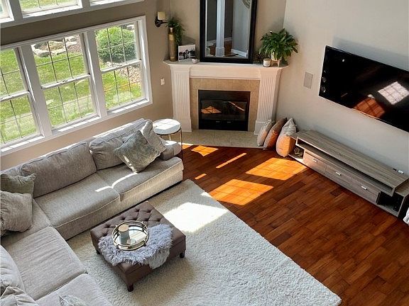 Gorgeous 4 Bedroom Scott McCue Home featuring a two story Great room with fireplace and large windows with a stunning view! The floor plan has a very nice flow to it, giving that fresh open feeling. First floor Master Bedroom with a full master bath. This home boasts a beautiful kitchen with hardwood floors, wood cabinets and a walk in pantry. The kitchen has French doors leading out to a covered porch for entertaining. The property is next to farm land which gives such a beautiful view. Only a few properties in this allotment have such a great view! The fenced yard is newly landscaped and has a nice waterfall feature. This home has been freshly painted this year and brand new carpet. The lower level has also been finished with a fantastic recreational room/beautiful fireplace, a large projection screen tv and a wet bar/cooler. This finished lower level also includes a workout room, additional bedroom for guests and a full bathroom. Large amounts of storage space! The upstairs has plen