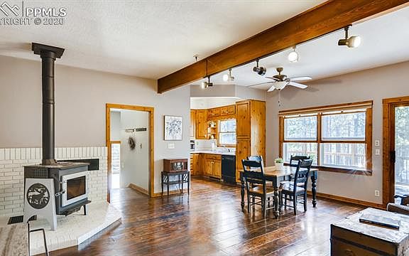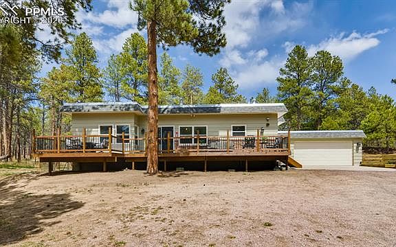 Desirable Black Forest Rancher on fully fenced 4.75 acres. 5 main level bedrooms, 2 bathrooms. Domestic well and zoned for horses. Newer upgraded variable frequency drive well pump. Radiant heating. Low utility bills! High end and top of the line Soapstone wood stove from Woodstock Soapstone that can heat up to 2200 sqft w/3 burners to cook on! Wide plank flooring throughout. Located in Award-Wining School District 20. New and expanded Composite deck, oversized 2 car garage, new garden beds, log cabin storage shed... Varied topography on this peaceful treed lot. From the Northern side of the property, take in Pikes Peak Views. Over 490 square feet of outdoor living on the new composite decking. Spacious living room walks out to the deck. Wood beam accents, newer lighting, wood stove with brick surround and wood storage cubby. This home features ample storage with many closets and built-in organization. The kitchen has updated stainless steel appliances, kitchen pantry cabinet, tile backsplash. The full bathroom has a large linen closet, newer vanity counter, custom built-ins. Newer interior paint. Spacious bedroom sizes, and 5th bedroom could be a great office space or den. Located across from the 359 acre La Foret property. Close proximity to Black Forest Regional Park with over 335 acres of trails, open space, and playground and picnic areas. Clean and ready to show! Acreage properties like this don't last! Make sure to look at the 3D floor plan!