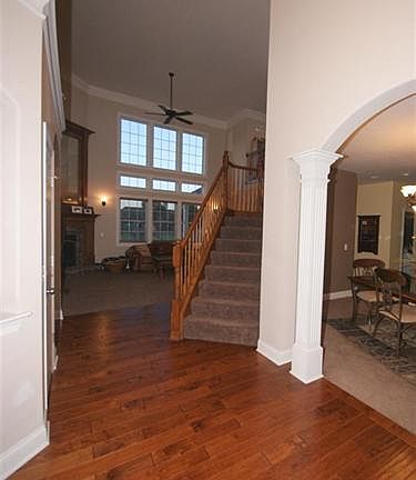 Custom built 2007 Scott McCue home features a two story entrance and great room with a full wall of windows, crown molding, corner fireplace, arched doorways, and niche! The great room is open to the kitchen with warm Maple cabinetry, hand hewn wide plank wood floors, center island with breakfast bar, walk-in pantry, desk, and French doors to the 15 x 12 covered patio. The formal dining room has fluted wood columns with an archway entrance and adjacent to the den with it's beveled glass door. There is a first floor master suite with a 9 x 7 walk-in closet, double sinks, and whirlpool tub. All of the bedrooms have walk-in closets and ceiling fans. The 18 x 8 loft outside the second floor bedrooms is a great place toys or reading. There is a first floor laundry & custom built boot box with bead board wainscoting. The 12 course basement is studded & partially drywalled. You cannot beat this .7 acre cul-de-sac lot! Best buy in the neighborhood!