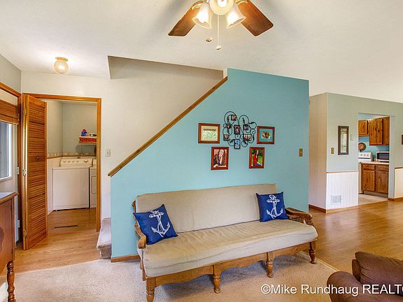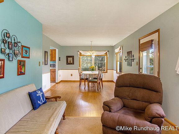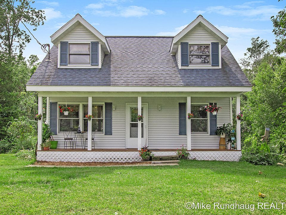 A charming country setting on 4.8 acres surrounded by woods and wildlife. This cape cod style home is loaded with charm and is situated on a beautiful piece of wooded land. The home offers an open floor plan, living area, dining area and kitchen, main floor laundry room and full bath complete the main floor. Upstairs offers 3 bedrooms with good sized closets. The walkout lower level is mostly unfinished but does offer a bedroom with an egress window. A two car detached outbuilding is located close to the house. This setting is charming and offers county living charm. Thornapple Kellogg Schools. A great setting and great location!