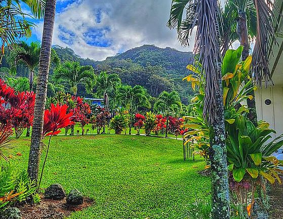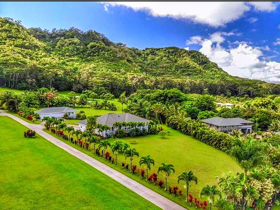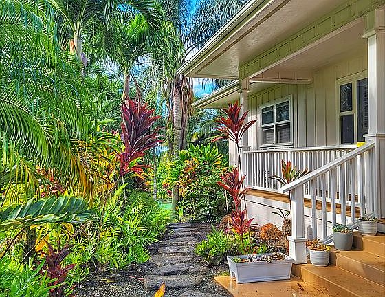 Beautiful plantation-style home located in Wailua Homesteads' prestigious Sleeping Giant Acres. Country living at its finest. This 2.39 acre property has spectacular views of Waialelale and Makaleha mountains. The main house has a large spacious kitchen, wood floors, 4 bedrooms and 2 full baths, and a large 2-car attached garage. The property also boasts an auxiliary 4-car garage structure with a bedroom, full bathroom, bonus room, and an outdoor shower. Lots of storage under both structures. Main house features include:central ACtankless Rinnai hot water heaterlarge lanai running the length of the househigh ceilings with crown moldingsstainless steel kitchen appliancescherry wood cabinetrygranite countertopswasher and dryerplantation shuttersThe landscaping includes many varieties of palm trees, ti plants, and flowering tropical trees and plants. There are banana and papaya plants as well as lychee, orange, lemon, and lime trees. Lava rock hardscaping is an added feature. Newly built pony stables with fully fenced in training arena. Complete solar and battery storage for both properties.