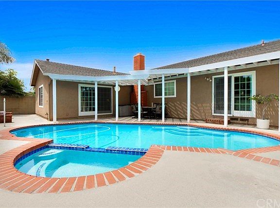 ATTRACTIVE SINGLE STORY 4 BEDROOM HOME WITH GREAT CURB APPEAL INSIDE THE NEIGHBORHOOD WITH NEWER 3 ZONE CENTRAL AIR CONDITIONING, SPARKLING POOL & SPA HAS NEWER DECK, IDEAL FOR ENTERTAINING & DUAL PANE WINDOWS & DOORS, SPACIOUS FAMILY ROOM WITH CATHEDRAL CEILING, SLIDER OUT TO SHADED BACK PATIO & POOL. KITCHEN WITH PANTRY, BREAKFAST BAR & GARDEN WINDOW OPENS TO DINING ROOM THEN STEP DOWN INTO EXPANSIVE FAMILY ROOM. BRIGHT MASTER BEDROOM WITH SLIDER TO BACK PATIO & SPA PLUS LOVELY UPDATED BATHROOM WITH CLEAR GLASS SHOWER ENCLOSURE AND GRANITE COUNTER, THREE ADDITIONAL BEDROOMS WITH REMODELED BATH IN HALLWAY, LIGHT & BRIGHT LIVING ROOM WITH SKYLIGHT PLUS USED BRICK FIREPLACE. FRONT(4TH) BEDROOM WITH DOUBLE DOORS CAN BE STUDY OR OFFICE, DECORATIVE BEVELED GLASS FRONT DOOR, 6 PANELED DOORS, SMOOTH CEILINGS, NEWER WATER HEATER, MINIBLINDS THROUGHOUT, FINISHED GARAGE WITH LOTS OF STORAGE, RESURFACED DRIVEWAY, MINUTES TO THE BEACH, DOWNTOWN SHOPS & RESTAURANTS, GREAT SCHOOLS!