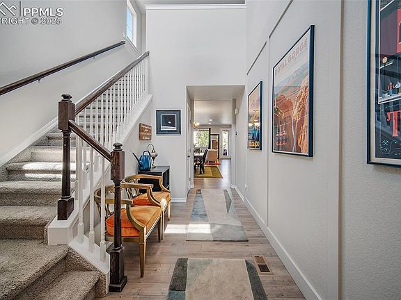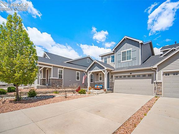 Welcome to your dream home in the heart of Rockrimmon! Nestled in the highly sought-after D20 school district, this spacious two-story home with a fully finished basement offers over 3,300 square feet of comfortable living space. Enjoy quick access to I-25, nearby shops and restaurants, and beautiful Rockrimmon Open Space just steps away. Located in a quiet, sidewalk-lined community, the home sits on a low-maintenance lot of over 4,000 square feet, featuring easy-care landscaping and a large, covered concrete patio—perfect for relaxing or entertaining outdoors. Inside, you’ll be greeted by soaring ceilings, abundant natural light, and quality finishes throughout. The open-concept main level features a stunning kitchen with a large island, quartz countertops, ample cabinetry, and stainless steel appliances—including a double wall oven, cooktop, microwave, refrigerator, and pantry. The adjoining living room boasts custom built-ins, a cozy gas fireplace, and direct access to the covered patio. The main-level owner's suite offers ultimate convenience with an ensuite bath featuring dual vanities, a walk-in shower, tile flooring, and a generous walk-in closet. A well-placed laundry area completes the main floor. Upstairs, enjoy a spacious loft with built-ins and a beverage fridge. Two large bedrooms and a full bath complete the upper level. The finished basement provides a massive secondary living space, perfect for entertaining, complete with a full wet bar. A generous bedroom and ¾ bathroom offer flexible living or guest accommodations.