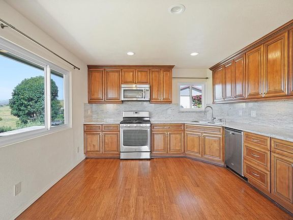 Peaceful Country Living with Panoramic Views in Bonsall, CA. Experience the tranquility of country living with breathtaking panoramic views in this charming two-story home nestled in the scenic hills of Bonsall. Offering 1,925 sq. ft. of thoughtfully designed space, this property blends comfort, privacy, and natural beauty, perfect for those seeking a quiet retreat with convenient access to amenities and top-rated schools. Situated on a private, beautifully landscaped lot, the home features a motorized gated entry for added security and a welcoming sense of arrival. Step inside to an open concept living area filled with natural light and sweeping hillside views. Engineered wood flooring, a cozy brick fireplace, and expansive windows create a warm and inviting atmosphere. The updated kitchen boasts stainless steel appliances, solid wood cabinetry, and granite countertops, ideal for the home chef. Upstairs in addition to a full guest bathroom, you'll find a BONUS ROOM that can easily serve as a third bedroom or a private home office. The lower level offers TWO SPACIOUS BEDROOMS and an additional full bath. The primary bedroom includes a walk-in closet and its own fireplace, offering a peaceful, cozy retreat. The flexible downstairs layout is perfect for a growing household, guests, or a home office. Outdoors, enjoy a serene, park-like setting with vibrant native landscaping, mature fruit trees, and thoughtfully designed hardscaping. Whether you're entertaining, gardening, or simply relaxing, the peaceful ambiance and stunning views provide a daily escape from the hustle and bustle. The spacious two-car attached garage adds convenience and additional storage. Located just minutes from shopping, dining, and Bonsall’s top-rated schools, this property offers the ideal balance of rural charm and modern convenience. Don’t miss this rare opportunity to own a slice of paradise in the desirable Bonsall community, where lifestyle, views, and value come together.