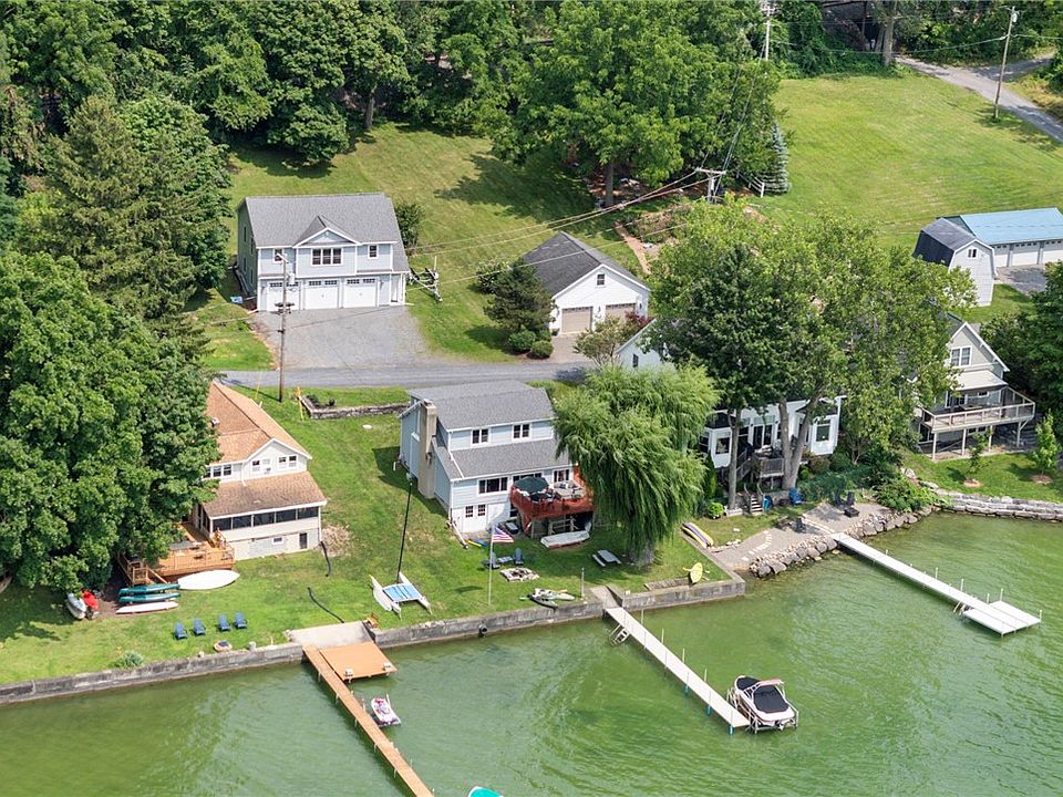Spectacular Cayuga Lake Sunsets & Endless Opportunities Here. East side of Cayuga Lake, level lake 67 ft frontage, public water & sewer, high speed internet, grass lawn, easy access from Rt. 90, two dwellings on property featuring 6 bedrooms and 3 1/2 baths, Laundry, a 3-Bay Garage (amazing space on lake). Modest 2 level Lake House with 4 bedrooms, 2 full baths, Living, Dining combo and Fireplace, and Large Lakeside Deck for Entertaining, and storage in the basement. The 2-story Carriage House built in 2014 has all the Modern Amenities, Great room w/ Cathedral Ceilings, Kitchen Island, Large Primary Bedroom with Built-ins, Walk-in-Closet and Changing Room. 2nd Bedroom or Office, Main Level Laundry (with utility sink) and a 3-Bay Garage for Vehicles, Boats, Storage, Creative Space & Rainy Day Fun. There's a dock, seawall and boat hoist (23 ft boats 4500 lbs) & fire pit. Great Swimming, Fishing, Boating and More! Both homes are year round. Centrally Located easy for shopping, restaurants, wineries and SYR/ROC Airports. Cayuga Lake is Navigable Water Ways, NYS Lock Systems. Plenty of Parking, Travel by boat to 15+ Wineries Brews & Eateries. Worth your time, qualified buyers please!