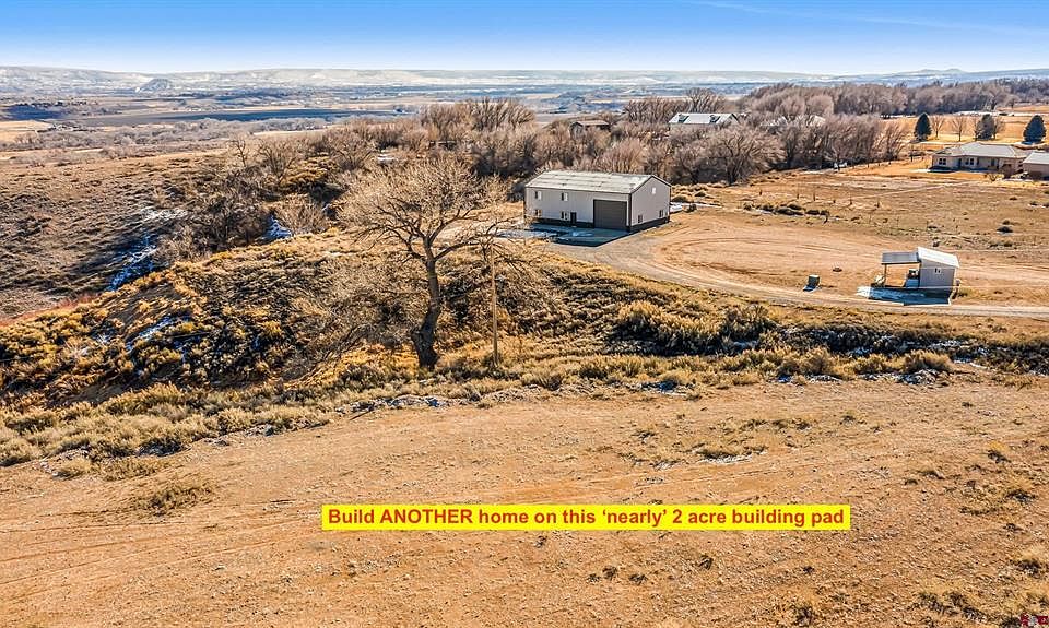 Wow! This hidden gem offers SO MUCH MORE than the spacious engineer-designed, barndominium. Situated on nearly 11 acres, this unique parcel of ground is already approved and allows for a 2nd home. Lucky you, an approximate 2+ acre building site has already been grubbed out and is ready to go! The existing home is a modern style barndominium that offers a unique aesthetic because of its custom design. Durable and efficient, this home integrates the metals and woods with a modern flair. Spacious bedrooms, huge doorless shower/tub combo, hickory cabinetry, pantry, laundry room with a stackable W/D, and a separate shower for your canine family members are just some of the special features it offers. Other features include a radon mitigation system, large garage/shop with an 18' door, 220 amp power, patio, central air, pellet stove, garden area, storage shed, and so much more! WAIT! Did you know there’s decreed water rights?! The parcel includes a decreed spring that can further be developed into multiple ponds. The advantage of spring-fed ponds are that they are clear and clean, and they run year-round. In addition to being an irrigation source, ponds can be used for livestock, stocked with fish, a haven for water fowl, or an attraction for wild life enjoyment. Another amazing feature of this property is the 360 degree mountain views of the Grand Mesa, San Juans, Uncompahgre Plateau, Black Canyon, or gaze over the Valley Floor below. Glorious sunrises and breathtaking sunsets offer a piece of serenity for early risers or winding down at the end of the day. The opportunity to create a stunning oasis with two homes and ponds doesn't come along very often so call today for your own private showing . *3rd bedroom is non-conforming (without a closet)