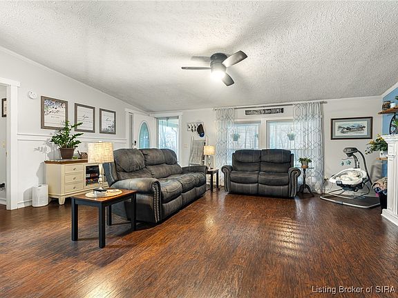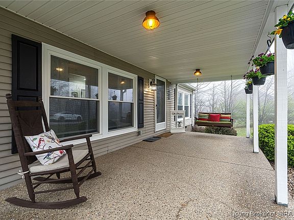 The serenity of county living on a dead end road within 15 minutes of Louisville can be yours. This immaculately maintained home will check all your boxes.This home features one floor living, split floor plan, 3 spacious bedrooms plus an office, 2 Full baths, an updated kitchen with new LVP floors, laminate hardwood throughout the rest and plush carpet in the mainsuite bedroom. The open concept of the living, dining and kitchen will make entertaining a breeze and the gas fireplace adds a warm and cozy feel. The spacious front porch has room for plenty of rockers and a place to enjoy the sound of spring rain on the metal roof. The back deck off of kitchen will be the perfect spot to grill out while watching the wildlife at the edge of the woods. A Miller's mini barn with electric and cable is included with a full price offer. Located in the highly sought after Floyd County School district. Updates include Replacement windows (2021) lifetime warranty. New HVAC (2021). Metal Roof (2023). Water heater (2017). New stainless Dishwasher, new microwave. Sq ft & rm sz approx.