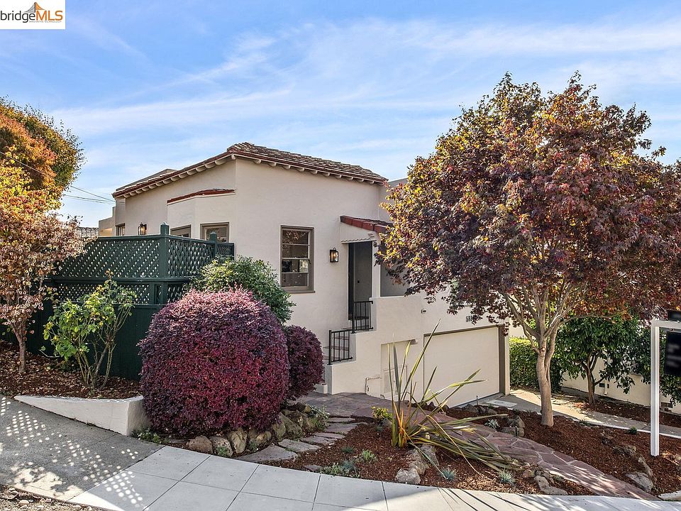 Glamorous Spanish Med with graceful arches and rich wood floors. Earthy tones and streaming light highlight this modernized home. The living room is appointed with a classic fireplace and built-in cabinetry. A large picture window overlooks the neighborhood. Peek-a-boo views are glimpsed from several windows. The kitchen has electric Bosch appliances for the gourmet. The demure dining room steps out to a large level deck for meals in the outdoor greenery. Gentle garden steps lead you through the side yard to the back garden. A split-level up is the primary bedroom, with French doors opening to the wide tiled patio, connecting in turn to the garden and completing the wrap-around grounds. A romantic seating area in the bedroom is an oasis for quiet time. Downstairs is a family room or ample fourth bedroom, with a comfortable office adjacent. Bonuses and extras at every turn and nook, including a sweet potting shed. Large storage off the garage in a partially finished basement space. In Oakland's sought-after Upper Rockridge, this is Home.