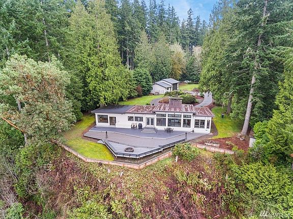 Superlative Sound & Olympic Mountain views. Single-level home on 2 separate tax parcels has been tastefully updated w/contemporary finishes: 12' vaulted ceilings; marble, granite & porcelain tile floors; marble fireplace surround; open & light floor plan; Corian kitchen counters w/eating bar; Dacor & Jenn-Air stainless appliances. Master suite w/5 pc. bathroom, large walk-in customized closet. Huge deck to take in the views. Park-like grounds. RV garage & shop.