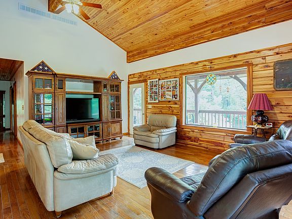 What a setting! This log home is located on over 5 acres on a paved road in the Southeast Dubois school district. This property features a 3bd/2ba home with an open floor plan and a full walkout basement, tons of storage in the 2 outbuildings sized 48 x 24 and 24 x 24, both with concrete floors, insulation, and electricity, a small pond with a dock, and a beautifully landscaped yard. The home has many updates, including a new roof in 2018, new A/C unit in 2015, and all new appliances. Save money on your heating bill by using the outdoor wood burner, or use the electric furnace as a backup. This home has so much to offer, from the beautiful landscaping to the wide covered porch running the length of the home, the bright and open living area to the privacy of the hilltop setting. You really must see it to appreciate it!