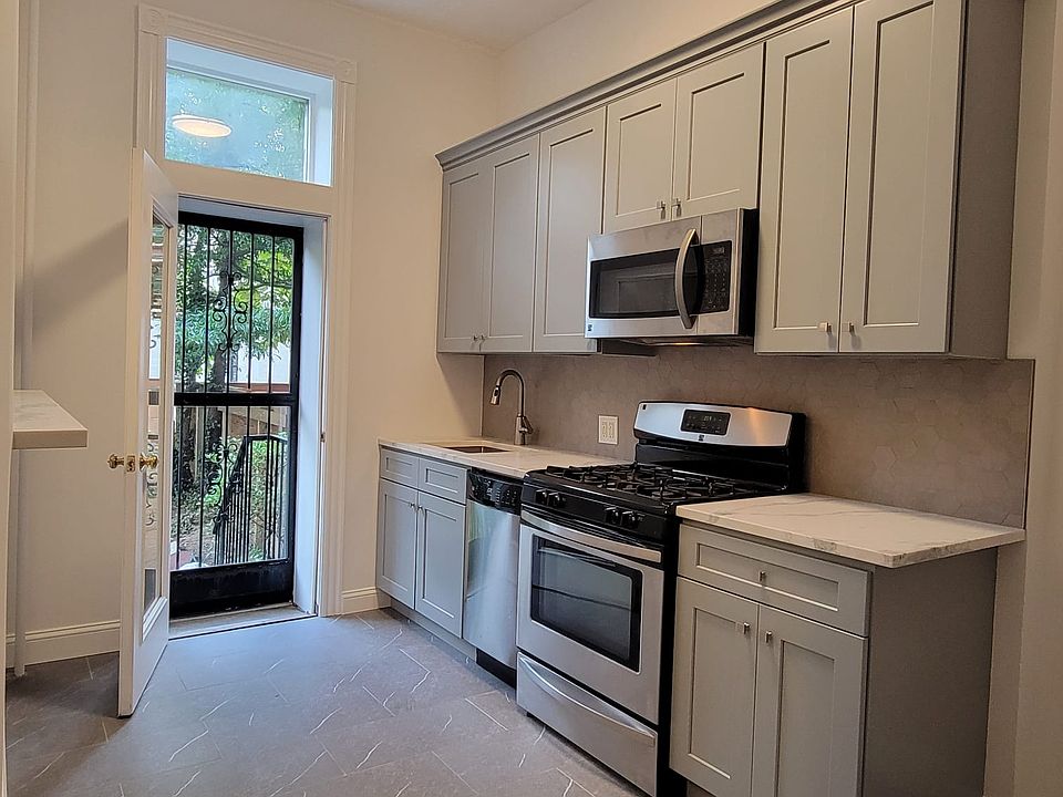 This large two bedroom apartment has high ceilings, brand new hardwood floors (newly installed) throughout, new kitchen cabinets and counter tops, newly installed ceramic tile kitchen floors, stainless steel appliances including a dishwasher, exclusive use of backyard, washer/dryer in unit and lots of closets! This apartment is located on the first floor of a 3 family dwelling between 7th and 8th avenues and is near shopping, restaurants, Prospect Park and the F/G subway lines.