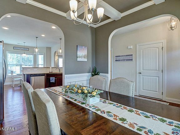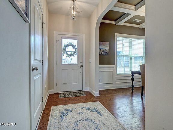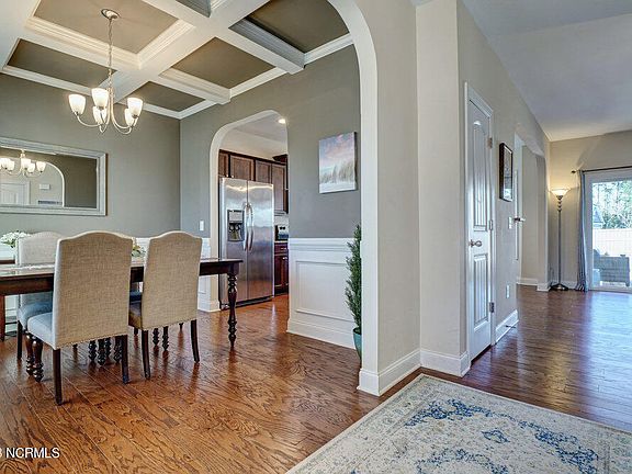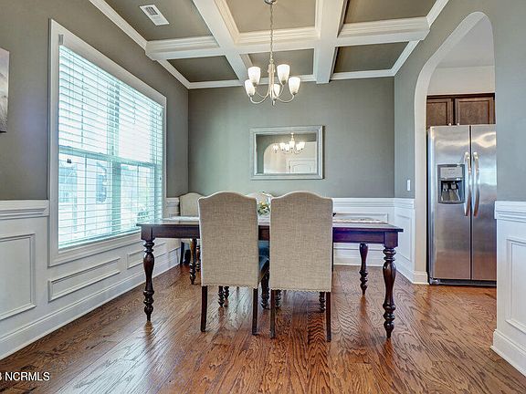 Welcome to the master-planned community of Wyndwater, which offers access to excellent amenities, including a community pool, green space, and walking trails. Residents are just 5 minutes from a public boat ramp and Kiwanis Park, and 20 minutes from the beaches on Topsail Island. The Homeowner's Association (HOA) also takes care of trash pickup, so residents don't need to worry about it. This house sits on a corner lot, providing extra privacy and a fully fenced yard with two access gates. The front yard is equipped with an irrigation system to help keep the lawn healthy and beautiful. In the rear yard is a storage shed for tools and other outdoor equipment. Inside the home, gleaming wood floors flow throughout the first level, which features a kitchen equipped with granite countertops and stainless steel appliances, and a formal dining room with a coffered ceiling. Accessible from the living room is a covered porch, perfect for enjoying your morning coffee or a cool drink. Upstairs is the primary suite and three additional bedrooms. The primary suite includes a private bathroom and spacious walk-in closet, and offers a comfortable retreat after a long day. This home is the perfect combination of comfort, convenience, and community living.