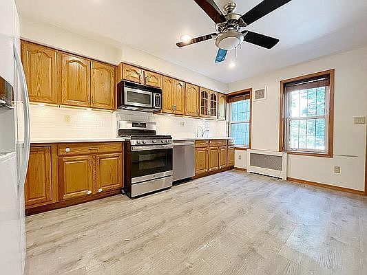 Welcome to 589 Decatur St, a historic townhouse nested on a tree line townhouse block and minutes walk from highly desirable Saratoga park and C or J train within 30 minutes commute from manhattan. Unit #2 is a spacious 2Bed 3 Bath duplex with finished cellar and private backyard. The ground floor features a spacious living room that leads into a modern eat-in kitchen with access to the private backyard and a full bathroom. The 2nd floor consists of two large bedrooms and a luxury modern bathroom. Both bedrooms can easily accommodate king size bed and dresser/desk. The finished cellar with a full bath can be easily turn into a TV room or home office with a separate laundry closet. Rent includes cooking gas and heating. One Pet Only! $500 Non-refundable Pet Fee.