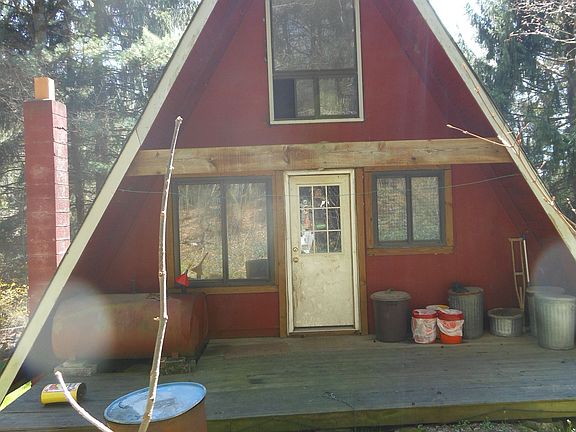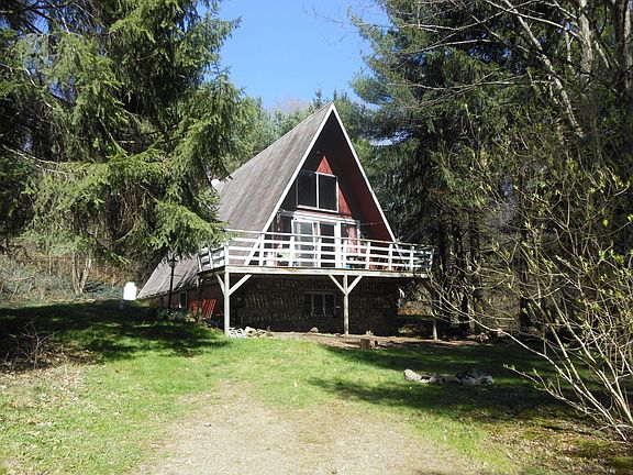 Enjoy this secluded A-frame on 2.4 acres tucked into a wooded setting.Detached 2 car garage and a small stream running thru property. Would make a great getaway or a nice home in a wooded setting. Come take a look, this won't last long.