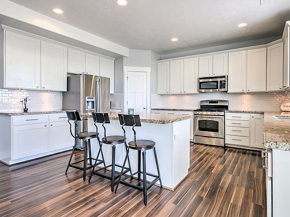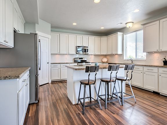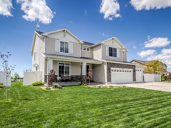 ******* Under Contract ******** This beautiful home with 5 bedrooms and 2.5 baths. Mini farm. The home has a 3 car garage (4 if you count one being 2 deep), as well as a workshop and a storage room. The lot is .79 acres with the back 3rd fenced off for pasture for horses or other farm animals. There is water on its own circuit to the pasture as well. The back has a very large, two-level patio, as well as an outdoor bed and a fire pit. A side gravel area is very large and would accommodate trailers, RVs, boats, etc. The backyard is fully landscaped with trees, flower beds, and garden boxes. Other features of the home include central vacuum, granite countertops throughout, custom fireplace, larger great room than standard plans, sitting area in the master bedroom, large bedrooms, laminate wood floors throughout the walking areas of the main level, video doorbell, ecobee thermostat, Rachio smart automatic sprinkler system, underground trampoline, secondary water/with irrigation already set up. The home is zoned for residential agriculture, meaning you can have some animals. There's plenty of room to park an RV and or trailer behind a fence. Inside the kitchen is large with plenty of room to bake and cook. (Solar panels not included)