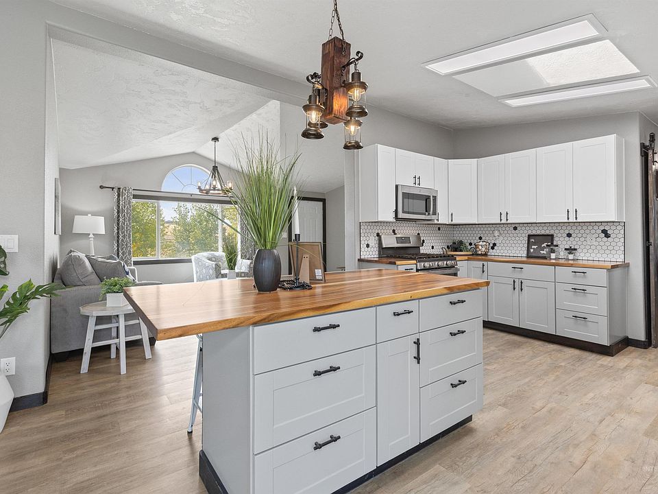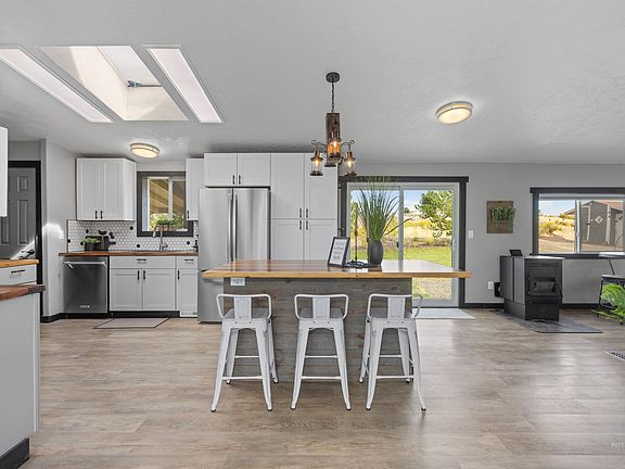Welcome to your fully updated home on the hill! Looking for space and a peaceful property to make your own; look no further. Perched on nearly an acre and a half, this move-in-ready home offers versatility to create your hobby farm or simple oasis away from the city. Every detail throughout the house has been impeccably updated, including a brand new kitchen equipped with a gas range, an island with seating and a sky light that highlights the beautiful Acacia wood countertops. The new Grand Teton pellet stove is the perfect spot to cozy up by all winter long, it even has bluetooth control from anywhere. The master bedroom suite is a private retreat with designer tile walk in shower, corner soaker tub and walk in closet.New flooring throughout. Fresh paint. Newer roof. New insulated 16x10 vaulted 12' ceiling tuff shed wired for mini split.Detached garage for 2 vehicles + storage. Easy freeway access and only 20 min into Emmett town. Plenty of room to build a shop, bring your animals & toys. No hoa.