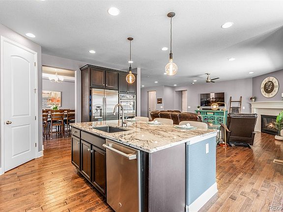 Stunning Designer Ranch Home in Crystal Valley! This practically new home includes over $180,000 in builder upgrades with professional landscaping and a fully finished basement. The expansive main floor boasts style and comfort with 8' doors, several bay windows, recessed lighting and hardwood floors throughout the open floor plan. The kitchen is an entertainer's dream with an oversized island, breakfast nook with bay window, granite countertops, stainless steel appliances, and designer backsplash. Work from home with ease in the private office with French doors, then retreat to a spacious main floor master suite with coffered ceiling and fan, patio door to private backyard, bay window and stylish en suite complete with a breathtaking walk-in shower, double vanity and walk-in closet. Enjoy large family gatherings or a quiet night in the bright living room with tiled fireplace and formal dining room big enough for a 10' table with a pop-out bay window. Another spacious bedroom, full bathroom with double sinks, key drop, and laundry room with cabinets and sink completes the main floor. Relax, play, entertain in the fully finished basement with enough space for a game room, home theater and pool or ping-pong table. The basement wet bar with chic tile, updated cabinets and granite countertops includes room for 4 barstools and a perfect place to make your favorite cocktail. The basement bedrooms have egress windows, plush upgraded carpet, and share a spacious bathroom with an updated shower and bench. The fourth bedroom is currently being used as a gym - a walk-in closet can be easily added just by putting in a closet door to the large adjacent storage room. The professionally landscaped backyard offers privacy with little to no maintenance, a beautiful patio with gas firepit, and gas line for your grill. This home offers plenty of storage in the basement and 3rd car garage. This customized Delaney floor plan could not be built for this price - too many updates to list!