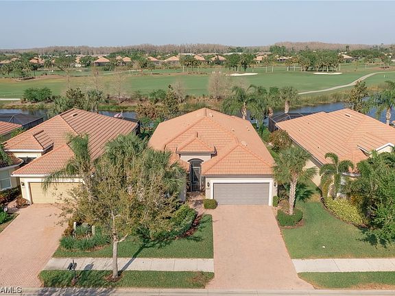 Less than one hour from Beautiful Naples and world famous beaches, this gorgeous Pulte built "Tifton" model home with an expansive golf course view, features tile and crown moulding throughout, plantation shutters, upgraded kitchen cabinets, custom lighting, elegant beveled glass front door, granite countertops, oversized laundry room, finished garage with tandem option, tankless hot water system and so much more. The huge extended lanai includes the picture window full view screen. Located in Del Webb Naples a 55+ adult active community with 18 sport courts, resort styled pool, spa, firepits, BBQ grills, gym, hair salon, golf simulator, billiards, darts, table tennis, sauna and year round events. With a full time lifestyle coordinator there is always social options. Touted as a 'Big Kind of Small Town' Ave Maria has shopping, restaurants, grocery, healthcare, parks, waterpark and a gas station and is a golf cart friendly town. This home includes full membership to Panther Run Golf Club.