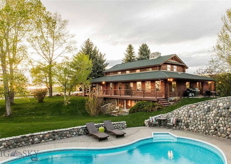 Sitting atop a private bluff w/ panoramic views, this picturesque mountain retreat 5 minutes from Bozeman marries western style w/ modern conveniences. Anchored by a double sided rock fireplace, the main floor of the log home is loaded with character and has views from every window. The upscale stainless appliances, abundance of cabinetry, raw edge granite countertops & large island w/ seating, make the kitchen the heart of the home & ultimate gathering space. The ground level master features a fireplace, private patio w/ hot tub, ensuite bathroom w/ luxury shower/sauna combination, plus an extra room for gym/theatre. Work efficiently from the home office with great Internet, hand-crafted built-in desk/storage and separate entrance for clients. Step outside to additional amenities including a new 3-car garage, heated pool, barn & 40+ fenced acres of wild hay for grazing. Two ADU's on the property provide addit'l room for guests, caretakers, or rental income. Potential for subdivision.