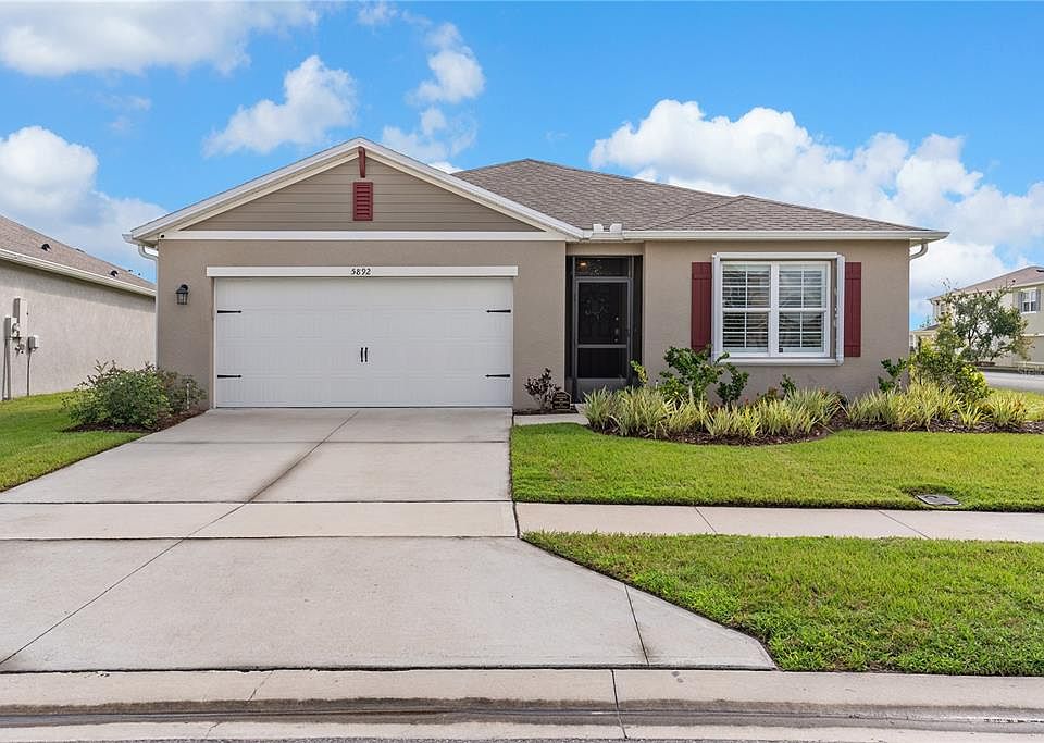 Under contract-accepting backup offers. “Welcome Home!! Almost NEW *Impeccably Clean 2022-Built 3 bedroom, 2 Bath Plus Den Private Pool Home, Ideally located in the Sought-after Riverstone community of Lakeland, FL. High and Dry at 141 ft Elevation, Designed for Modern living, this residence offers a Spacious Open layout paired with Thoughtful Upgrades throughout! Inside, you’ll find Plantation Shutters, Water softener, Granite Counters, A Large Center Island with seating area, SS Appliances, GE Washer/Dryer, 6 Ceiling Fans, and a Fully Vented Garage. Safety and Convenience are covered in this *Smart Home-controlling thermostat, garage door, and alarm system by a phone app. Hurricane shutters, and a Portable Generator with an Electric panel outlet capable of powering the entire home. The Primary Suite Features a Beautifully Appointed Bathroom with a Custom Shower door, while the home’s Open Design provides flexibility for Entertaining or working from the den. Step outside to your Private Backyard Retreat: a Sparkling Saltwater Fiberglass Pool (San Juan, 12x25, 10,000 gallons) with Electric Heater, Robotic Cleaner, and a Pristine Paver Pool Deck. The Pool is Fully Enclosed with a Screened Cage, Privacy Screen, and Enhanced with Starlight Pool Cage Lighting on Timers and Remote Control. A Separate Screened Lanai and Screened Front Entry add to the Indoor-Outdoor Lifestyle. Additional features include a Vinyl Privacy Fence (shared access to neighboring home), French drain, Gutters and Downspouts, Plus plenty of Storage and Peace of mind. Riverstone offers a Welcoming Community Setting in Lakeland, Is Golf Cart Friendly, Combining Convenience, Style, Comfort, Location-Perfectly placed between Tampa & Orlando!!—Making this home the Perfect Place to start your next chapter!” Riverstone Offers Resort-Style living—2 Community pools, Clubhouse, Playground, Dog Park, and Miles of Sidewalks—All Near Some Wonderful Dining, Shopping, Healthcare, Lakeland Airport, and Top-Rated George Jenkins Schools Offers AP Courses, Gifted and Talented Programs and 22 Sports!!