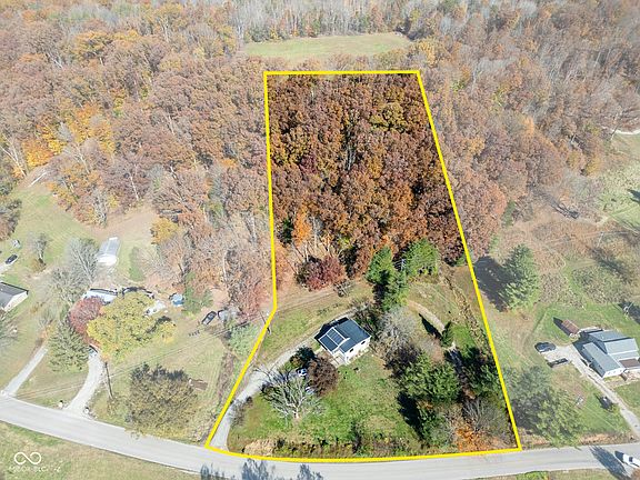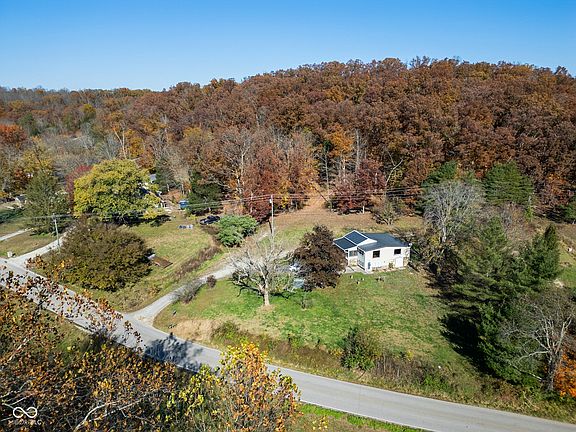 Early 1900s Brown County cabin on 3 acres. In 1968 the little cabin on a hill was added onto and updated, a walkout basement was even added under the front of the addition. The original one-room cabin is now the kitchen of this much larger home! On the east side of the cabin, a 12x13 bedroom and full bathroom have been added; on the front a living room and second bedroom were added with a basement under them. On the west side of the original cabin, there is now a 19x7 enclosed porch with louvered windows. The basement is only partially finished but has space for a bedroom, second living space, and even a small kitchen; the basement laundry and full bathroom are usable but need drywall. Out back, a 10x12 deck and ramp face the garden and woods. In front, the driveway leads to a concrete parking pad, and a circular gravel drive offers even more parking. The gas furnace, central air, and windows were all replaced in the last 5 years; the roof was replaced in 2025. The huge kitchen has a stainless steel gas range and refrigerator plus a big center island. The main-floor laundry is just off the kitchen. This house has new vinyl plank flooring and the upstairs bathroom has been updated with a beautiful custom tile shower. The primary bedroom has a big walk-in closet. The crawl space under the original cabin and the basement addition have both been professionally waterproofed by Acculevel. All kitchen and laundry appliances remain with the home. 200 amp electrical breaker box. Septic was pumped by Snyder's in 2025. Possession is available at closing. The gravel drive up the hill leads to a flat area that could be a small build site--a soil analysis by Mike Salem passed for a future second septic site. Roughly half of the 3 acres are wooded.