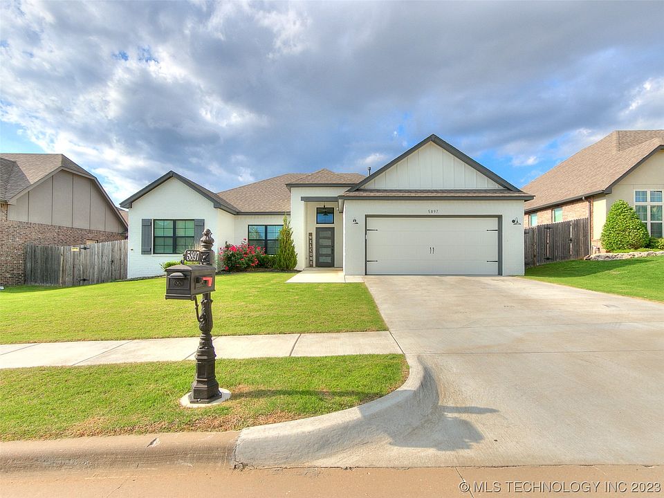 This gorgeous home built in 2021, is loaded with upgrades, and still looks Brand New!! Features include full brick, professional landscaping, large open living, gas log fireplace, big beautiful windows, 10ft ceilings, white Quartz countertops throughout, bright and beautiful kitchen with island, custom painted cabinets, soft close drawers, black hardware, stainless appliances, corner pantry, four bedrooms, two full baths, and Epoxy garage floors. Master suite has vaulted ceilings, private bath with custom tiled shower, free standing soaker tub, his and her sinks, Delta fixtures, Huge master closet, right off laundry and a built-in drop zone. Split bedroom plan, all rooms have great big closets. Fully fenced backyard, sidewalks, Neighborhood Pool and Qualifies for RD 100% Financing. In addition to everything listed: this home was built by one of Tulsa's most reputable builders. If you're looking for a beautiful home, that was built to last, with high end finishes, and Newer Everything- THIS IS IT.