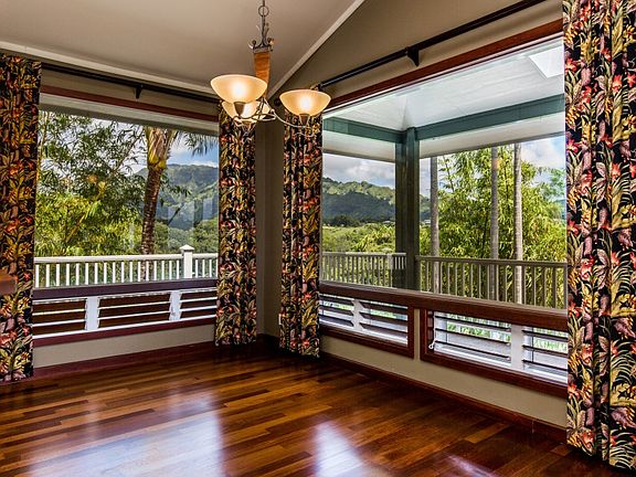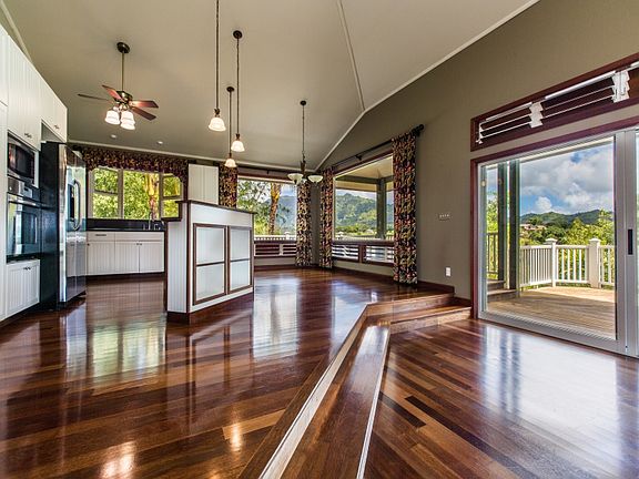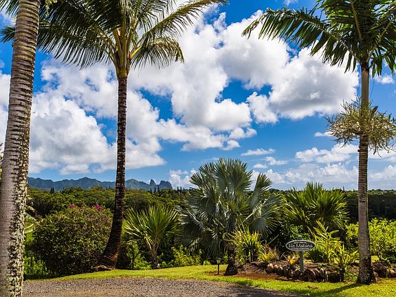 Views galore! Sweeping views of gorgeous mountains and valleys - from Waialeale, Makaleha and Kalalea mountains to the distant ocean - greet you each day from the wrap-around lanai off the back of this custom home located in a quiet and exclusive neighborhood on a private, dead-end street. Beautiful Merbau hardwood floors throughout the living space and high vaulted ceilings in the great room area open to large windows and sliding doors that bring the outdoors in. There is also a family room/den that can be closed off if you have extra guests. The kitchen features granite surfaces, stainless steel refrigerator, stove and microwave with a gas cooktop in the center island. A wonderful home to entertain in, with the almost 1000 square feet of Ipe wood lanai and a private deck with hot tub to relax at the end of the day. The 624 square foot downstairs unit, with its own full bath, was recently re-tiled and is perfect for extended family, or as a separate office or art studio. This one acre property sits on its own knoll and gives you plenty of room for gardening and landscaping. There are many native tress and fruit trees, including koa, kamani, munroidendron, hala, lime, lemon, avocado, along with several varieties of palms and even clumping bamboo. This is a one-of-a kind property you don't want to miss. Definitely NOT a drive-by! Come take a look.