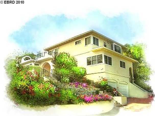 Delightful 4 bedroom, 2.5 bath upper rockridge traditional on a corner lot that provides sunlight, privacy and sweeping views of The hillside. Spacious living room and formal dining room with two sets of french doors that open to the patio and garden. Master bedroom suite with private balcony - perfect for viewing the night skies. Extra large garage with workshop and extensive storage. Patio has gas line for "outside kitchen" and side patio features basketball hoop.(Source: zBestListings.com(11) for VisualShows.com on 4/26/2011)
