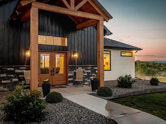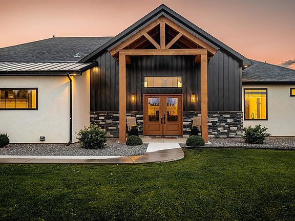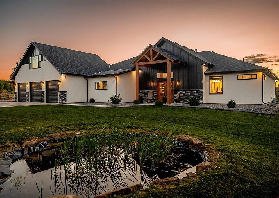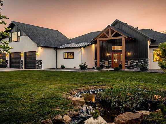 Modern Elegance Meets Colorado Charm on 3.05 Irrigated Acres Modern and cozy unite in this absolutely stunning custom home, perfectly nestled on 3.05 irrigated acres in the desirable Ponds Edge subdivision of Montrose. The property offers a private pond, spacious fenced yard, large covered porch, and beautifully maintained landscaping—creating an unforgettable first impression. The home’s exterior features a striking mix of neutral stucco, stone, metal, and wood accents for a one-of-a-kind look. Inside, the open and airy living space is filled with natural light and centers around a floor-to-ceiling stone fireplace with a wood mantel, while large windows frame views of the back patio and pond. The chef’s kitchen boasts a massive island with a single-slab quartz countertop, abundant cabinets, generous counter space, and seating at both the island and adjacent dining area. A walk-in pantry, stylish half bath, and spacious laundry with built-in storage bench add convenience. The oversized, deep 3-car garage offers ample room for vehicles and gear. The luxurious primary suite is a true retreat, featuring a spa-like bath with a freestanding soaking tub, five-head walk-in shower, dual vanities, and beautiful finishes. Two additional bedrooms share a large full bath with dual sinks and excellent storage. Upstairs, a flexible heated and cooled bonus room provides endless possibilities. Enjoy incredible outdoor living with the expansive patio, private pond, beautiful views, and peaceful country setting. This home is truly one of a kind—schedule your showing today!