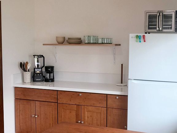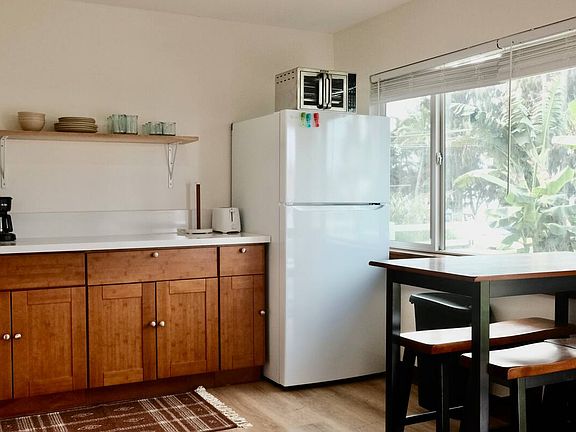 Perfect for one person, this studio is furnished and features a Casper memory foam king bed. The kitchenette is equipped with a two-burner hot plate, microwave, coffee maker, blender, toaster oven, full-size fridge, rice cooker, and basic cookware everything you need for simple meals. The bathroom includes a large kitchen-sized sink. There is a shared outdoor grilling area with a propane grill, picnic table, and an additional sink. Enjoy the convenience of a outdoor shower with hot-water. The studio also includes a teak dresser, air conditioning, a 55-inch flat-screen TV with a swivel mount, and free laundry. Parking for one car is provided.