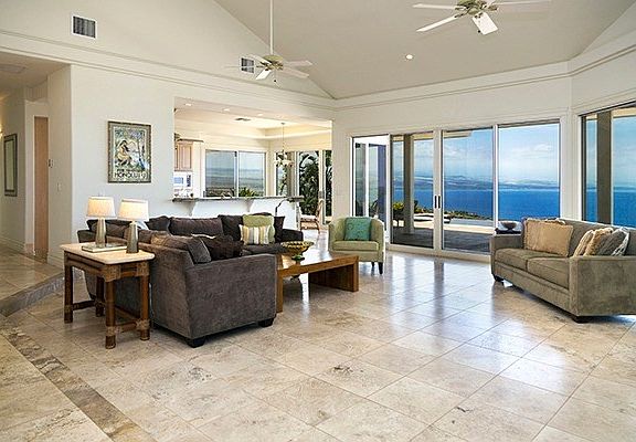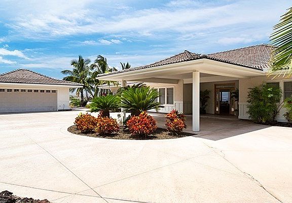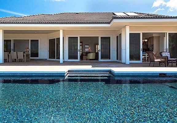 This resort-style home enjoys one of the most panoramic views in the lower Heathers section of the gated Kohala Ranch community. The great room and two master suites are oriented to enjoy the ocean and coastline views. While the lanai and infinity-edge swimming pool are sheltered from the trade winds, the orientation also benefits from on-shore breezes, and with the many sliding doors onto the lanai, you will rarely need to use the zoned air conditioning in the home.Situated on a 3 acre fully fenced lot, the home is surrounded low-maintenance landscaping that gives a welcoming tropical appeal with plumeria and palm trees lining the entrance. Park under the port-cochere or in the two-car garage with built in storage closets. Opening the front door, the ocean view draws you through the great room out onto the covered lanai extending the full length of the home. The two master suites on on opposite ends for privacy. A third bedroom in the middle could also be used as an office or media room. The 2,648 sq ft single story residence has been lightly used as a second home by the current owners and the top of the line appliances still look like new.