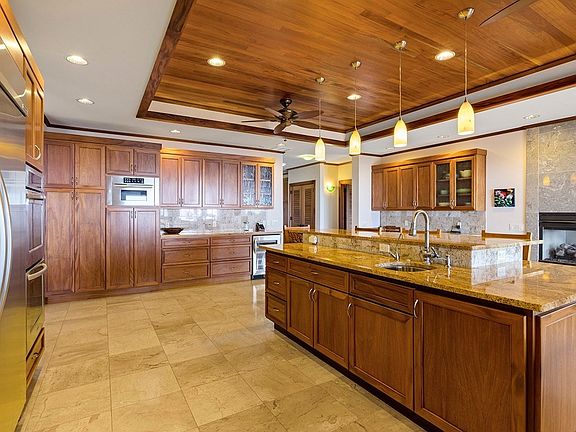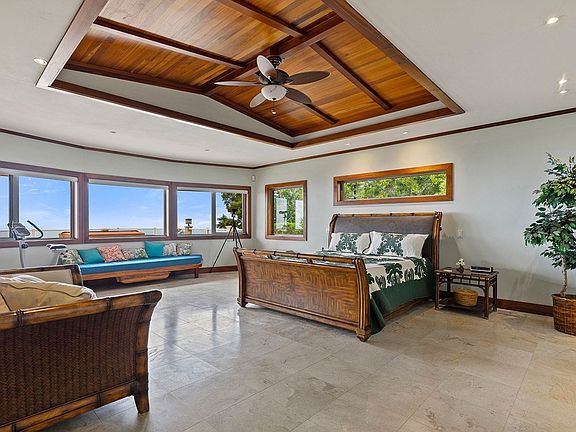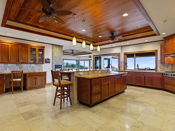 This high-quality, custom Kohala Ranch home with ultimate privacy and endless ocean, mountain, coastline views and year-round sunsets is an entertainer’s dream. The expansive covered lanai includes an outdoor spa that awaits incredible stargazing found on the Kohala coast. With over 4,000 sq ft of home, 1,700 sq ft of covered lanai areas and a nearly 1,300 sq ft garage with a special feature designed for a boater in mind with one bay sporting 11 foot tall doors at each end which allows you to drive completely through without trying to back out. Limestone flooring, Colonial Gold and Imperial Gold granite countertops and South African mahogany woodwork blend effortlessly throughout the entire home.