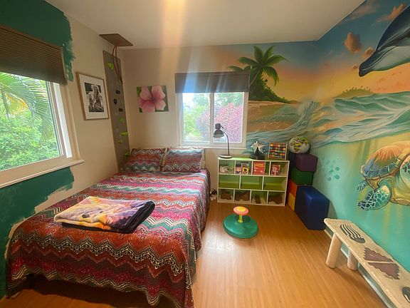 I'm renting my family home a 3 bedroom 2 bath home for 1 month only starting end of February into March 2025. It is situated on a gated acre property with fruit trees, chickens, a playground, and a cat! It is 2 minutes up the hill from the best beaches on the North Shore of Oahu. It is a very family friendly home with plenty of outdoor space for kids to run around. The entire house is located on the 2nd story with a flight of stairs to climb up. Their is a King size bed, a queen and a full size for each room. There are 2 full bathrooms with showers and tubs. All sheets and towels are provided. All of our personal belongings will be removed. In the bedroom with the queen bed is office space and a printer if you need to work while you are here! The kitchen is completely stocked with all cooking and eating utensils. The home looks out upon the property with views into the mountains and jungle. It has a real farm and tropical feel with countless different fruit trees and a chicken coup in the back. Parking is safe and on the property next to the home. Rent includes all utilities - electricity, water and internet. We do not have cable. Renting only for 1 month either February or March 2025. House comes with a very friendly cat that must be fed.