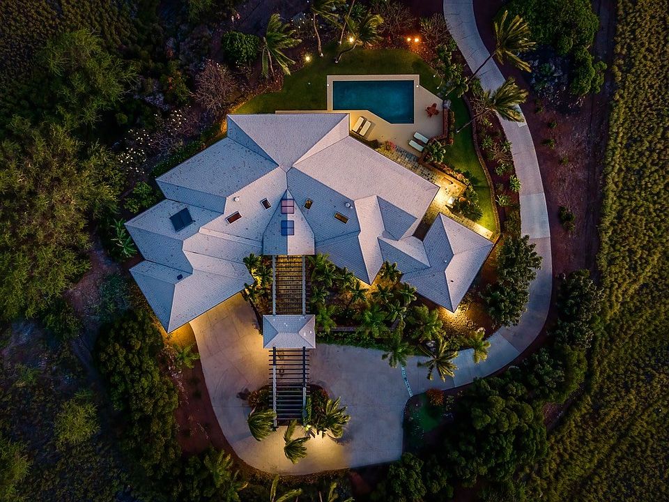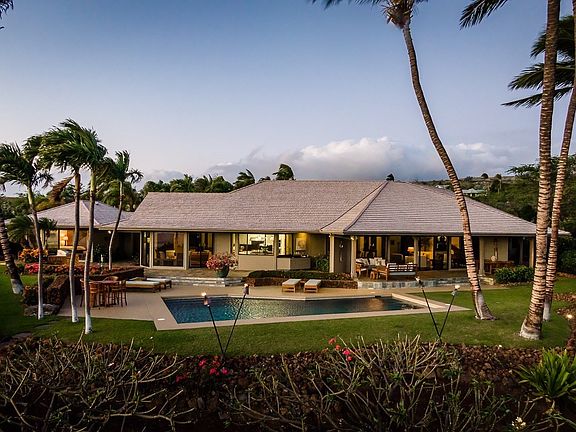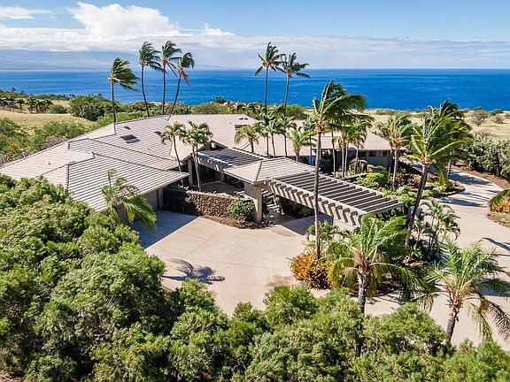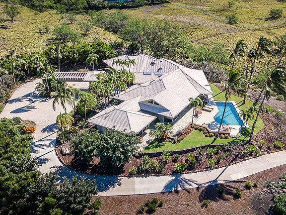 Elegant and timeless, of superior construction quality and finely maintained, 59-468 Pili Place sits on a most desirable lot in the Heather’s of Kohala Ranch. Located on a cul de sac, gated and completely hidden from the road with a long meandering driveway up and over a bridge, the home is sited on five acres. With 3-mountain views - Mauna Kea, Mauna Loa, Hualalai and the island of Maui, this is the pinnacle, the essence of Kohala Ranch for location, privacy, views, space and weather. The 360-degree views include the Gold Coastline and the green hills of the Kohala’s, seasonal whale watching and daily extraordinaire sunsets. The luxurious approach to the home is lined with mature landscape on all sides as the property is enveloped in tropical splendor. Swaying palm trees, plumeria of all colors, fruit trees, fragrance wafting throughout the gardens and a magnificent turquoise jade plant overhangs the drive circle island and generous porte-cochere. Approaching the home, you are fully engaged in the experience of discovering what is up ahead and will likely miss the discreetly ground mounted full photo voltaic system for energy efficiency. The design by the famous architect Lucky Bennett, is brilliant w/2 bedrooms and 2.5 bathrooms in the main section of the home; a consideration for utilities and maintenance when residency is low. A 3rd bedroom suite with separate entrance is semi-attached allowing for privacy for the owner and their guests or family. The 4,416 sqft. home also includes a combined great room and formal dining, expansive kitchen and family room and a studio/office/gym off the oversized 647 sqft. garage w/newly epoxied floor. The principal bedroom suite at the far east side of the home is stately w/a sitting room, dressing area, double walk in closets and large bath suite of pale green marble. Over 2,000+ sqft. of lanai and throughout the gardens are abundant plumeria, gardenias, puakenikeni and pikake for fragrant days and nights.