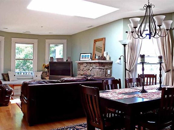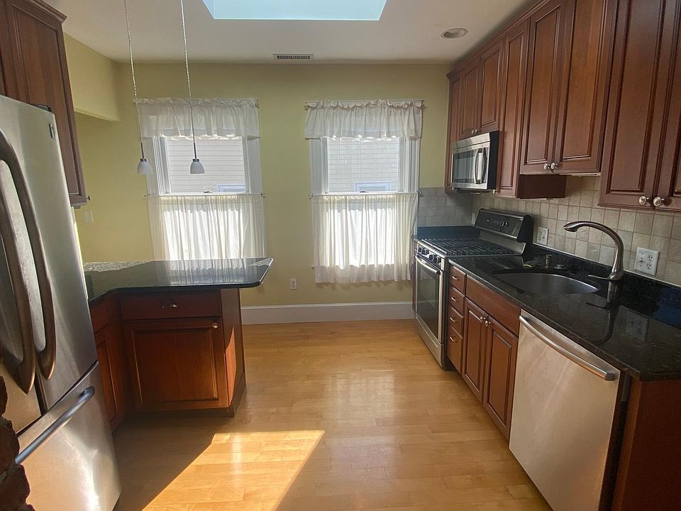 Modern 3rd floor apartment in a 3-family home, 2 bedrooms, 2 full baths. Gleaming hardwood floors throughout, eat-in kitchen with dishwasher and disposal, in unit laundry and 1 off street parking spot is included. High quality 1200 sq ft penthouse unit with 2 oversize skylights, exposed brick and unique open floor plan. 8 min walk to Porter Square/commuter rail, 12 min walk to Davis Square. Gutted to studs in 2007! Insulated Anderson windows, central A/C. Cherry kitchen cabinets with Bosch s/s appliances and granite counters. Living room features custom storage window seat and stone gas log fireplace. Large Master BR with full bath, oversize jacuzzi tub and custom tile work. 2nd full bath with subway tile and built-in cabinets. Fantastic front deck with beautiful sunset views. Additional rear deck with roof access and deeded roof rights. Stunning wide plank maple floors throughout and gets phenomenal sunlight! All this plus oversize deeded off street parking spot and storage shed. Nothing to do but move in and enjoy! A must see!! (Reference #140602) Full fee to tenant. First month and one month security deposit due upon signing the lease