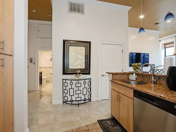 Victory Lofts stunning Soho-style 2-bedroom, 1.5-bath condo located in Bayonne. This modern residence features 15-foot ceilings thru out the entire unit, Italian porcelain flooring, massive south-facing windows and garage parking. The open concept kitchen is equipped with granite breakfast bar and GE stainless steel appliances. The primary bathroom is spa-like with dual vanity sinks, a free-standing soaking tub, and a separate stand-up shower. A convenient half bath is ideal for guests. Both bedrooms comfortably sized with built in shelves. Additional highlights include central air and in-unit washer/dryer. Victory Lofts is an Elevator building with a welcoming lobby and on-site exercise room. Prime location near shopping and restaurants. Commuting made easy, NYC transportation and the Lite Rail Station both close by.