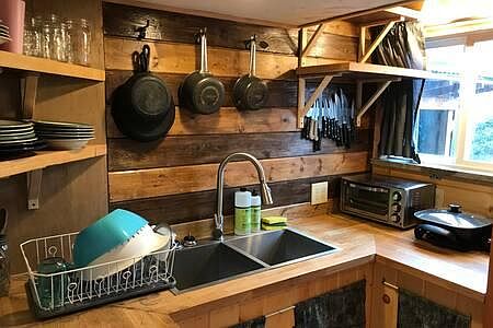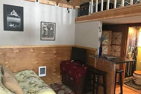 This is a tiny house that with a loft. It has steep stairs that are more like a ladder up to the bed. it comes with furniture in the pics. If you have things you would rather have in the space, I can move the stuff out. It is at the back of a normal sized city lot. There is space for gardening if interested. This tiny house has everything a persons needs to live. A kitchen with all the dishes and cooking abilities. No oven. There is a full sized fridge. A queen sized bed with no box spring on the floor of the loft, is very cozy.. You need to be able bodied to climb the loft to queen bed, they are steep stairs. There is a shower and a toilet. There are 2 electric wall heaters. Electric on demand hot water. A nice covered sitting area outside on a porch. All utilities are included in the monthly rent. This includes garbage, Comcast internet, electric heat and water.
