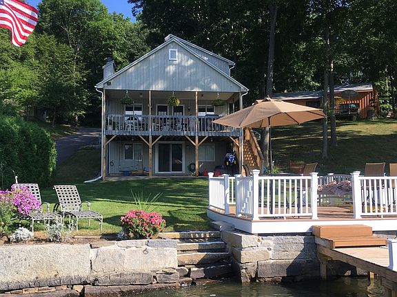 DIRECT WATERFRONT HOME on desirable Markham's Bay of Lake Pocotopaug. Enjoy the spectacular views all day long! Recently converted to year-round living with propane heat and central air. Lots of remodeling and upgrades too - white Kitchen cabinets, all stainless steel appliances, 6 panel doors, new flooring, new 16X16 deck by water, new L-shaped dock system 32X24. Fabulous open floor plan with soaring ceilings highlight the beauiful Great Room stone fireplace and second floor loft area. 3 Bedrooms (one on first floor), 2.1 Bathrooms. A finished walk-out lower level offers wonderful additional living space with a renovated half bathroom and lots of storage as well. Come enjoy life on the lake!
