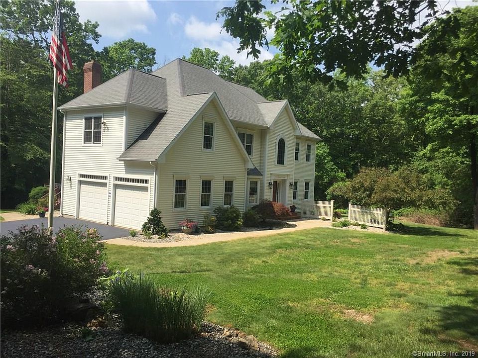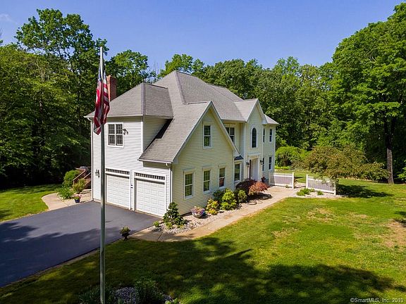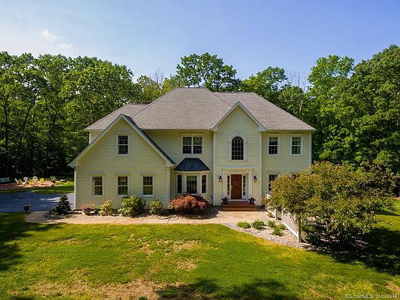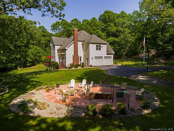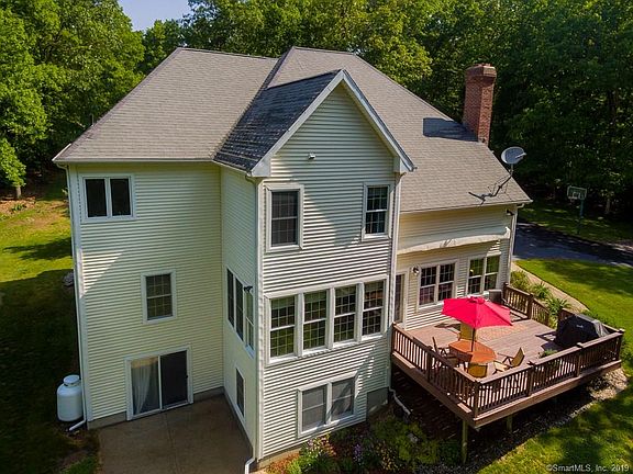 Custom colonial on 8 acre wooded lot at end of private cul-de-sac. Open floor plan with large kitchen leading to family room with cathedral ceiling, rear staircase and fireplace. Two story foyer with main stairs leads to living room and private study with french doors. Large dining room with chair rail wood work. Master bedroom suite with Brazilian cherry flooring, stall shower and whirlpool tub. Second floor has three additional bedrooms, full bathroom and laundry room. Fully finished walkout lower level has slider to private patio, workshop, storage room and rough plumbing for additional bathroom. Entertain on rear deck with electric awning or relax on large paver patio with built-in fire pit. Bluebird Lane is a private road with annual maintenance fee of $800. Come see this unique home today.