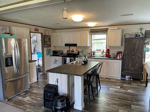 Lots of space in this beautiful Mobile Home with permanent foundation. This energy efficient home includes solar panels and metal roof and is situated on almost an acre lot. Home features a split floorplan with 2 living areas perfect for family; a great room and a formal Livingroom. Kitchen has an abundance of cabinets and large middle island with eat-in bar open to both living areas. Stainless steel appliances, luxurious master bedroom and bath with walk in closet, separate shower with garden tub. 3 additional bedrooms and 2 of these have walk in closets for plenty of storage space. Additional features include walk in laundry, one car carport, and 2 storage buildings that remain with the house. 10 minutes from shopping and schools on a cul-de-sac lot.